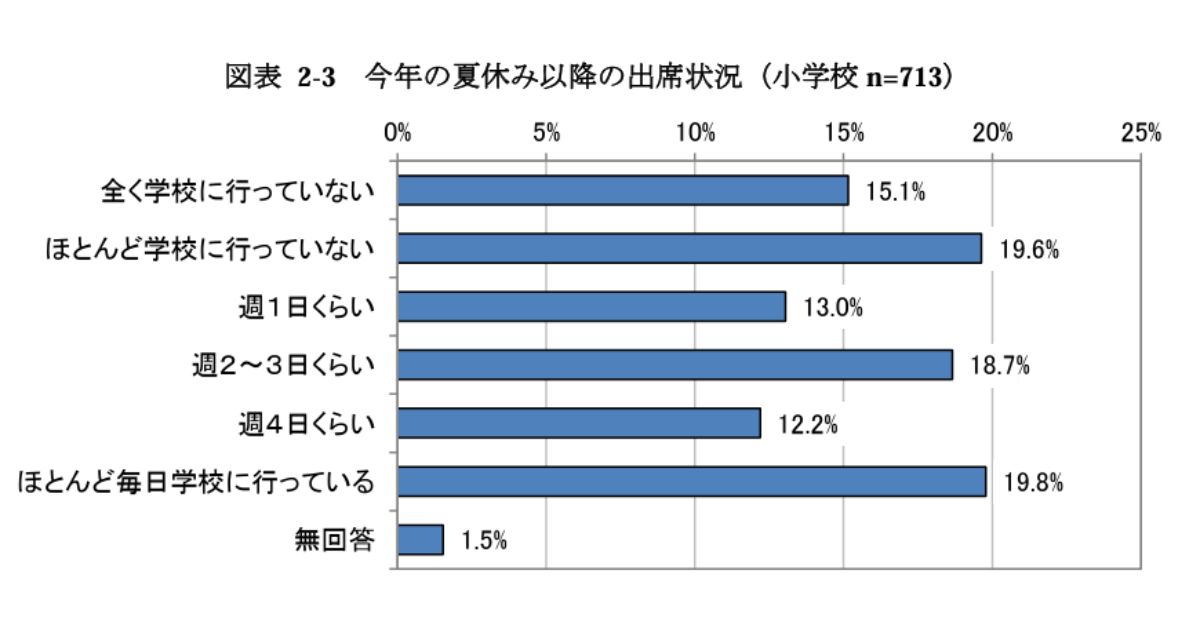 文部科学省の調査によると、前年に不登校を経験した児童生徒のうち、学校に登校又は教育支援センターに通所の実績がある人の約63.7%が、夏休み明けに週1日以上学校へ通うようになっています。(出典:文部科学省「不登校児童生徒の実態把握に関する調査報告書」)