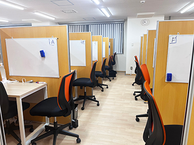 キズキの授業は、講師と生徒さんが1対1となる、完全個別指導です。そのため、授業ブースも一人ひとりのために独立しています。講師と生徒さんの距離が適度に近いため、授業に集中でき、わからないことはすぐに気軽に質問できます。空いているブースは、自習や食事に利用できます。