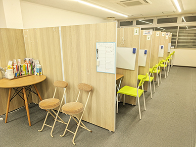 教室に入ってすぐのところに、相談のためのスペースがあります。入会前のご相談はこちらで行います。入会後も、勉強や進路、生活などについてのご相談をお受けしています。
