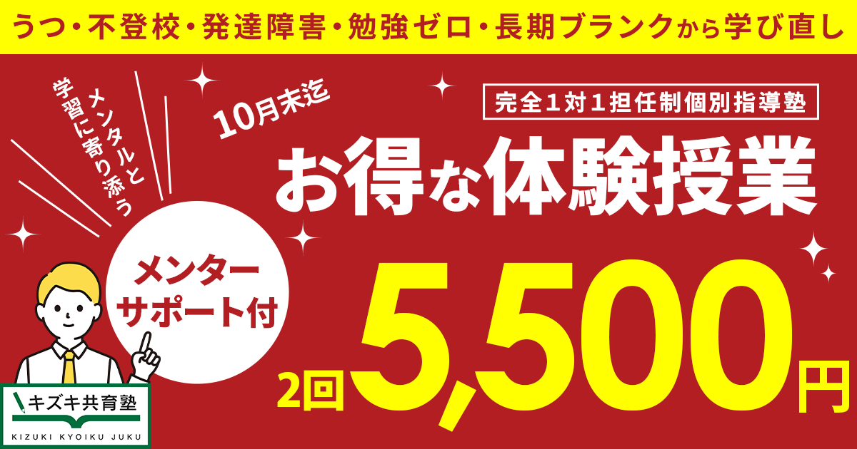「次の一歩」に進むきっかけを提供するため、2025年10月末まで(申込期間)、キズキ共育塾では「体験授業キャンペーン」を実施します!通常の授業と同じ、完全オーダーメイドの授業を2回お試しいただける特別なチャンスです。